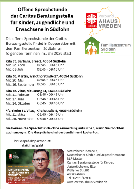 Das Familienzentrum Südlohn bietet daher in enger Kooperation mit der Beratungsstelle des Caritasverbandes offene Sprechstunden mit dem Sozialpädagogen Matthias Wahl an. Ziel der Sprechstunde ist es, Eltern und Familien aus dem Umkreis der Einrichtungen des Familienzentrums eine wohnortnahe Beratung anzubieten. Bei Bedarf kann Herr Wahl auch zu weiteren Angeboten (Gruppenangebote, Diagnostik, Elternseminare …) der Beratungsstelle vermitteln.