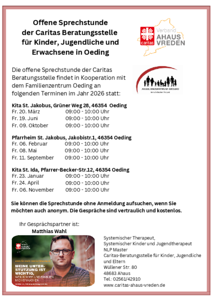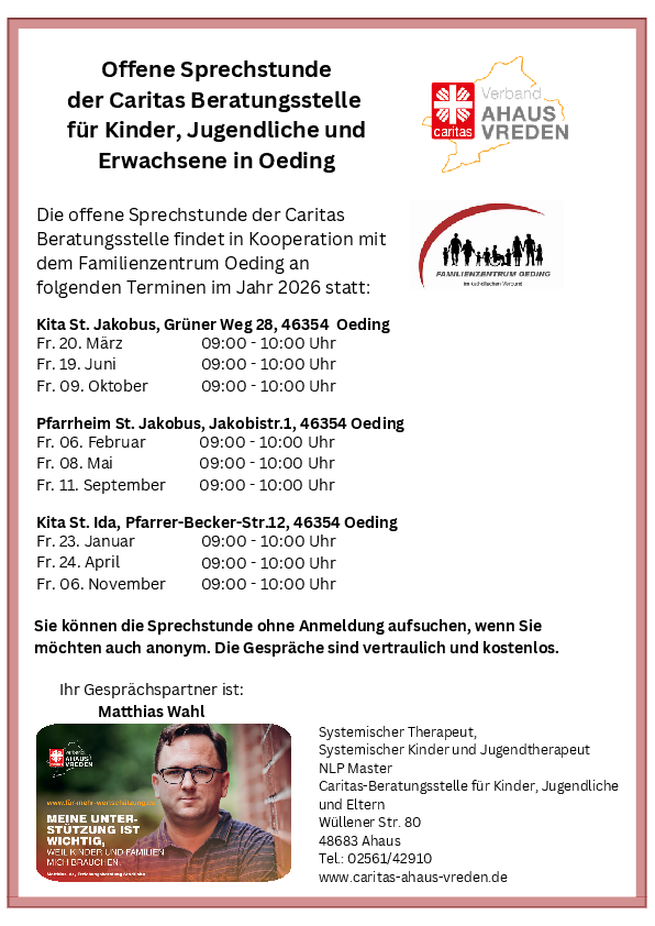 Die offene Sprechstunde der Caritas Beratungsstelle findet in Kooperation mit dem Familienzentrum Oeding an folgenden Terminen im Jahr 2026 statt: