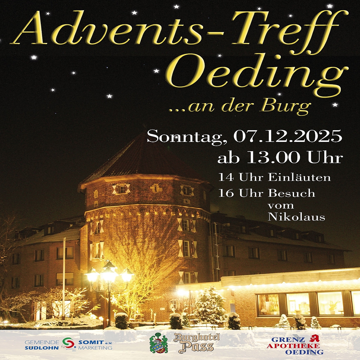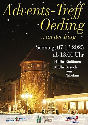 Auch in diesem Jahr findet am 2. Adventssonntag ab 13 Uhr im bekannt romantischen Ambiente der Oedinger Burg der Advents-Treff statt. Dieses besondere Ensemble sorgt bei Groß und Klein für vorweihnachtliche Stimmung.
