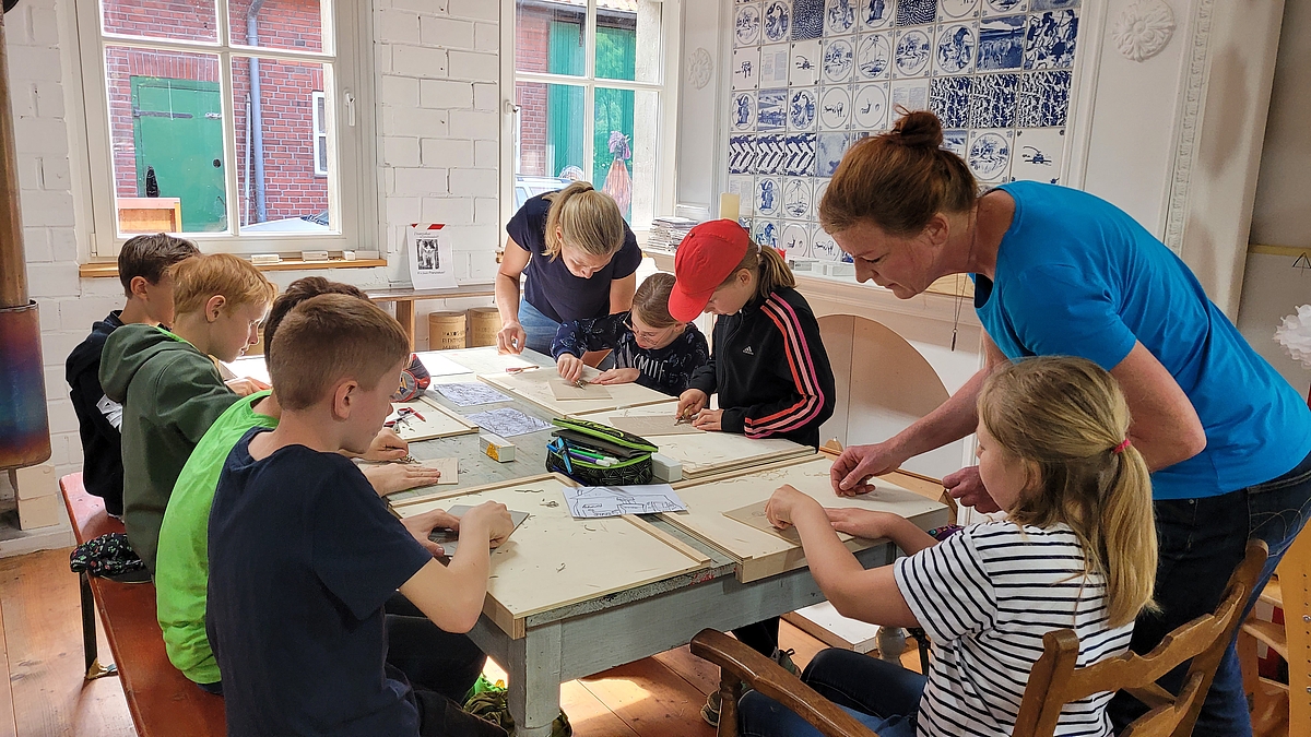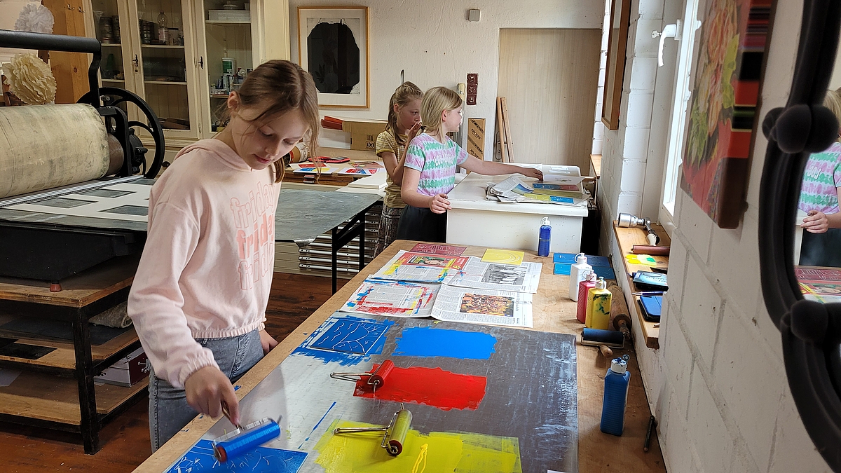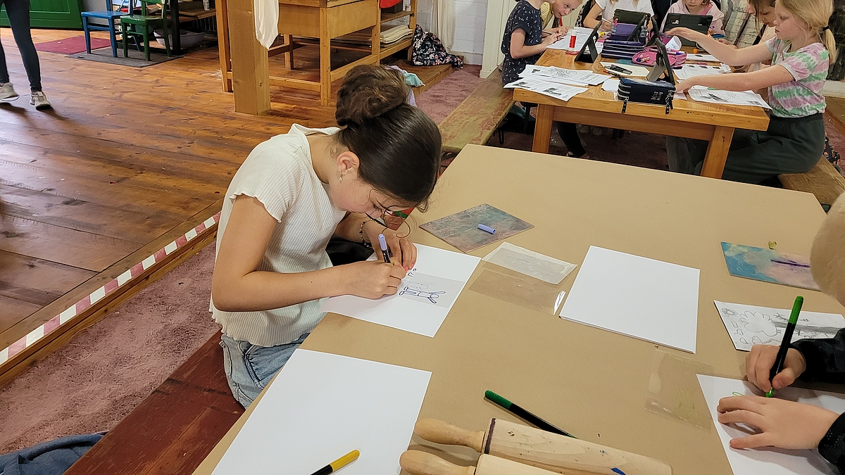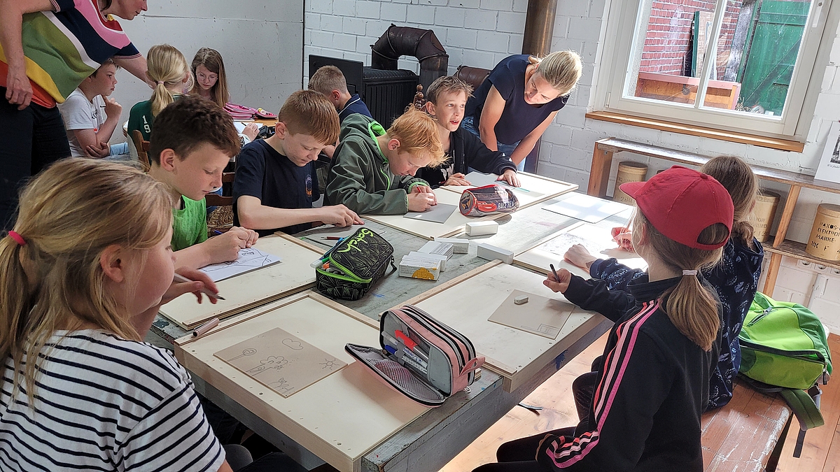 Die Kinder wurden kreativ und gestalteten zunächst ihre eigene Druckvorlage. Dafür malten sie selbstausgewählte Motive mit einem Bleistift auf eine Linolplatte. Diese Motive schnitten die Schülerinnen und Schüler dann mit Schnitzwerkzeug aus. Dann wurde die Linolplatte mit Farbe eingefärbt. Mit Farbwalzen ging das kinderleicht! Nun wurde ein Blatt Papier aufgelegt und mithilfe von großen Druckerwalzen das Papier an die Platte angedrückt.