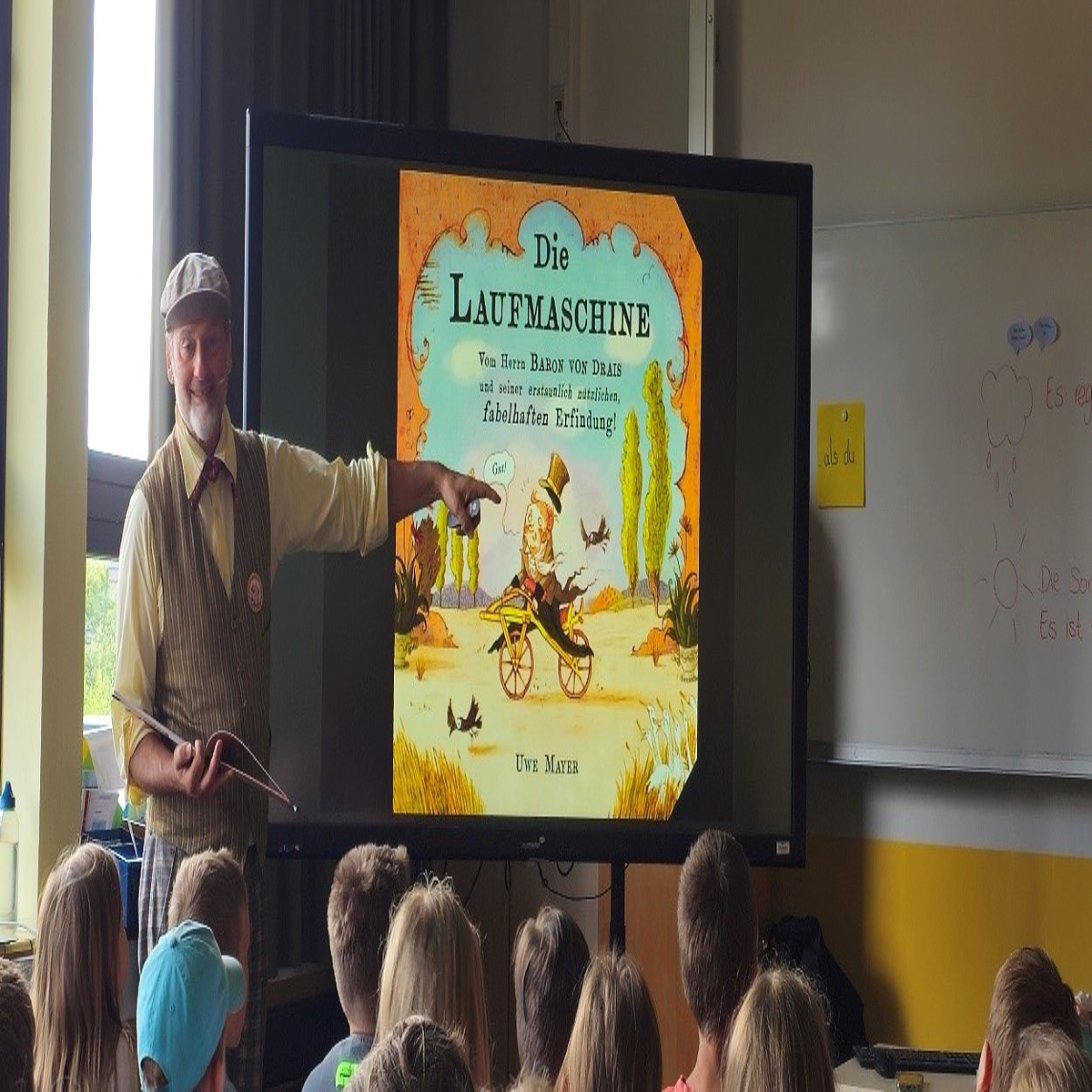 Am Donnerstag vor den Sommerferien haben die Kinder der von-Galen-Schule für ihre erfolgreiche Teilnahme am Schulradeln-Projekt ihre Urkunde von Frau Thesing (Klimamanagerin der Gemeinde Südlohn) und Frau Müller erhalten. Ob es der Weg zur Schule, zu einem Treffen mit Freunden oder eine Fahrradtour mit der Familie am Wochenende waren, die gefahrenen Kilometer wurden gesammelt. Alle Kinder der Schule haben zusammen 13.396,2 km mit dem Fahrrad in der Zeit vom 1. bis zum 21. Mai zurückgelegt. Die Klasse mit den meisten geradelten Kilometern (2833,1 km) erhielt für diese Leistung den Wanderpokal der Schule. Herzlichen Glückwunsch Klasse 3b! Für alle Kinder gab es eine tolle Überraschung, organisiert durch Frau Thesing: Der Bilderbuchautor Herr Uwe Mayer stellte den Kindern den Erfinder des Fahrrades, Herrn Drais, vor und er erzählte mithilfe seines Bilderbuches „DIE LAUFMASCHINE - Vom Herrn Baron von Drais und seiner erstaunlich nützlichen, fabelhaften Erfindung!“ von der Entwicklung des Fahrrades. Was Schlittschuhe, Heißluftballons und ein Vulkanausbruch damit zu tun haben, können die Kinder auch noch einmal in der Bücherei nachlesen. Dort liegen nun 2 Exemplare des Buches zur Ausleihe bereit.