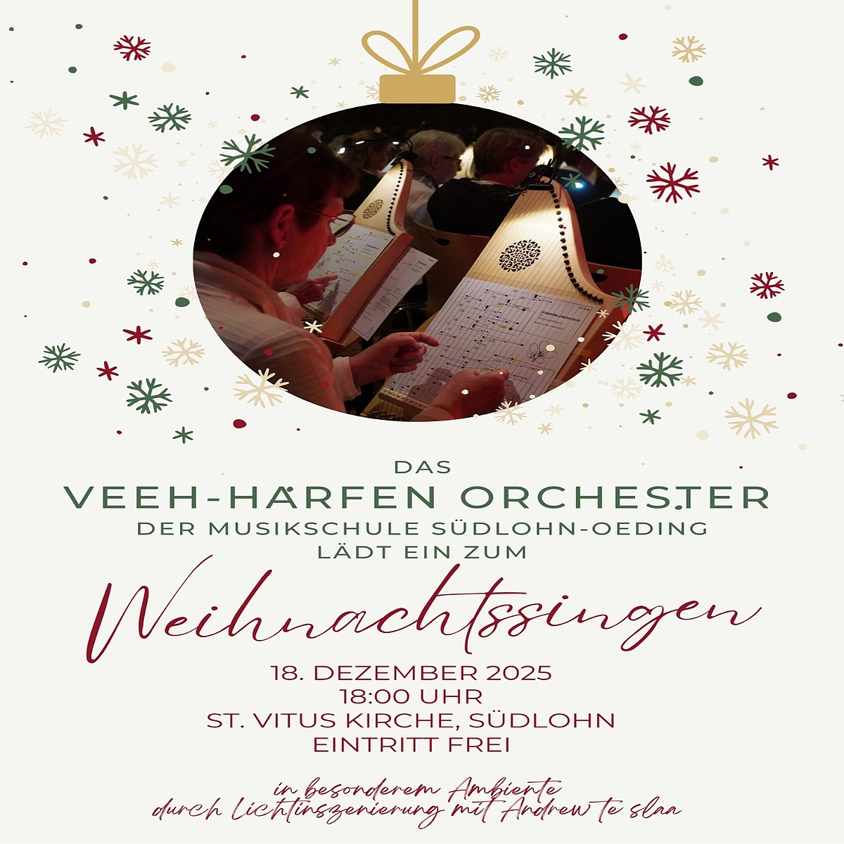 Am 18. Dezember 2025 um 18 Uhr ist es wieder soweit. Dann erklingen die Veeh-Harfen der Musikschule wieder in der St. Vitus Kirche in Südlohn.